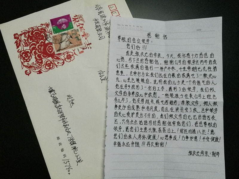 職工家屬寄來的感謝信